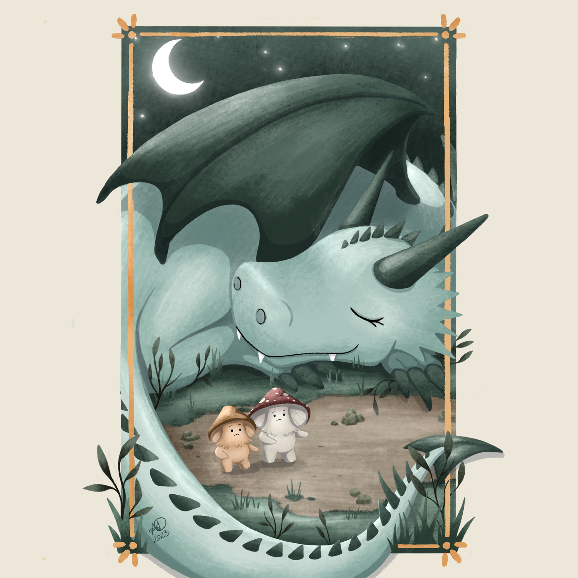 Our little mushrooms continue their journey and, soon enough, they discover the path is blocked. By a sleeping dragon. They creep past it very quietly, they do not want to wake it.