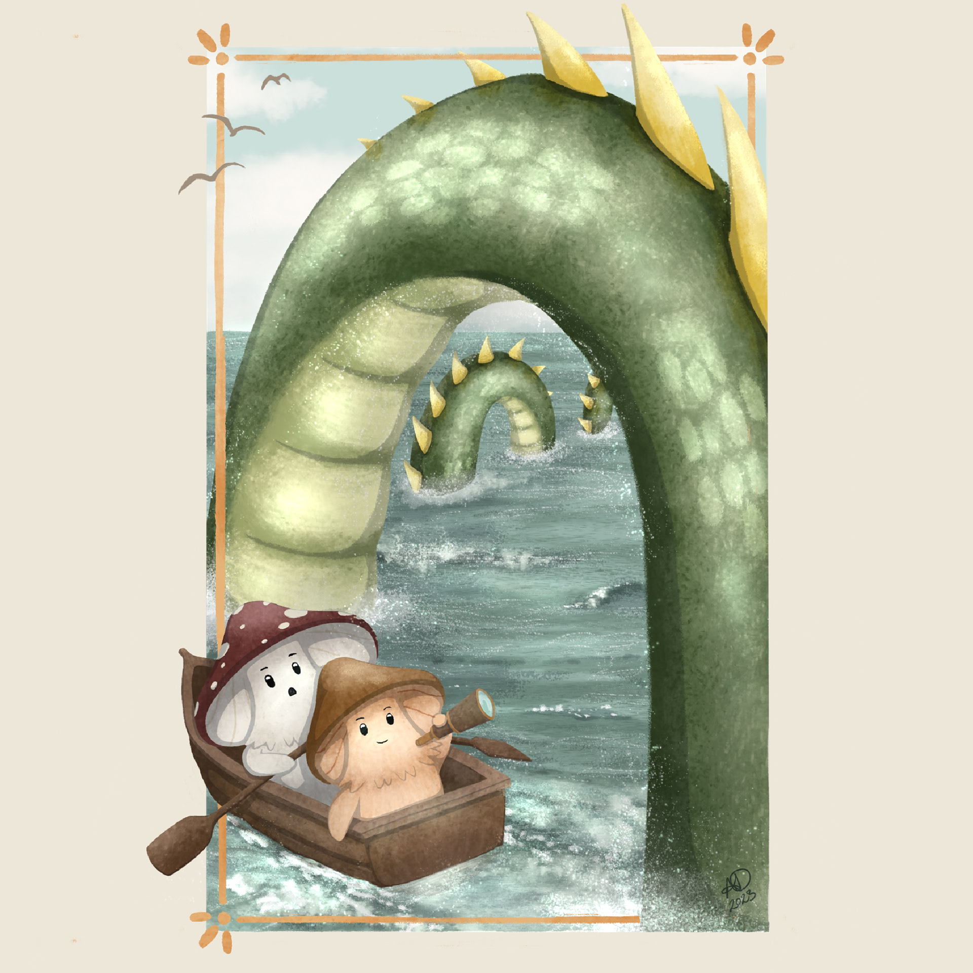 Our little mushrooms don't remember crossing the sea but the road is leading them that way. So they hire a boat and start rowing. It all works out though, they get a close encounter with a sea monster which they record in their notebooks immediately as soon as they reach dry land.