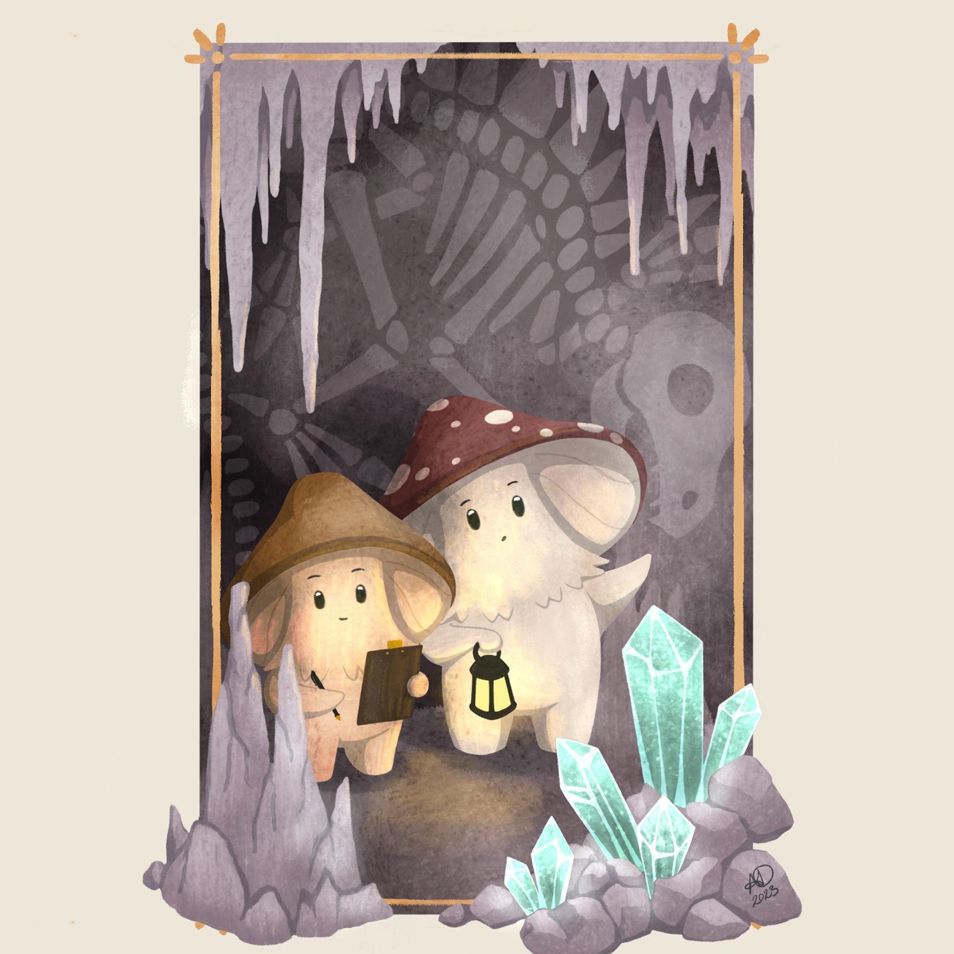 Our mushrooms have made it past the dragon only to find themselves in a deep dark cave. And then they turn a corner to find a treasure trove of fossils and glowing crystals.