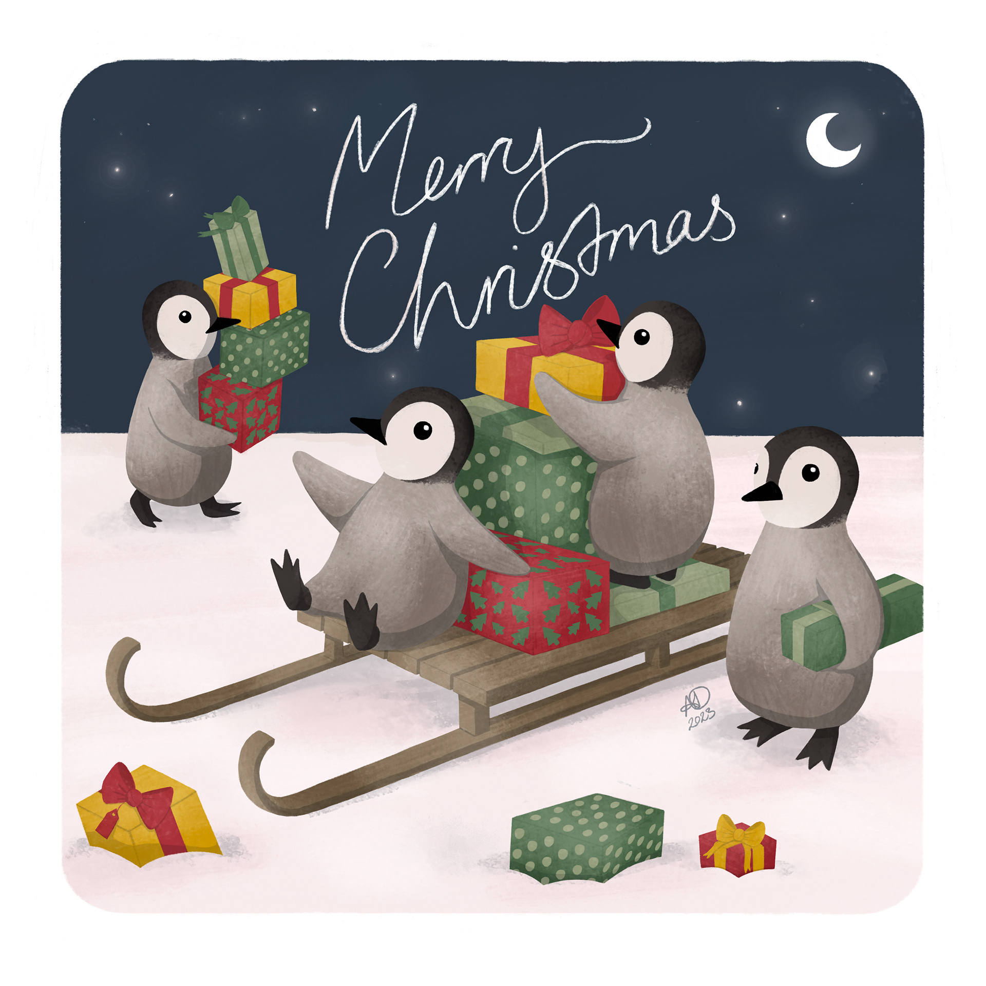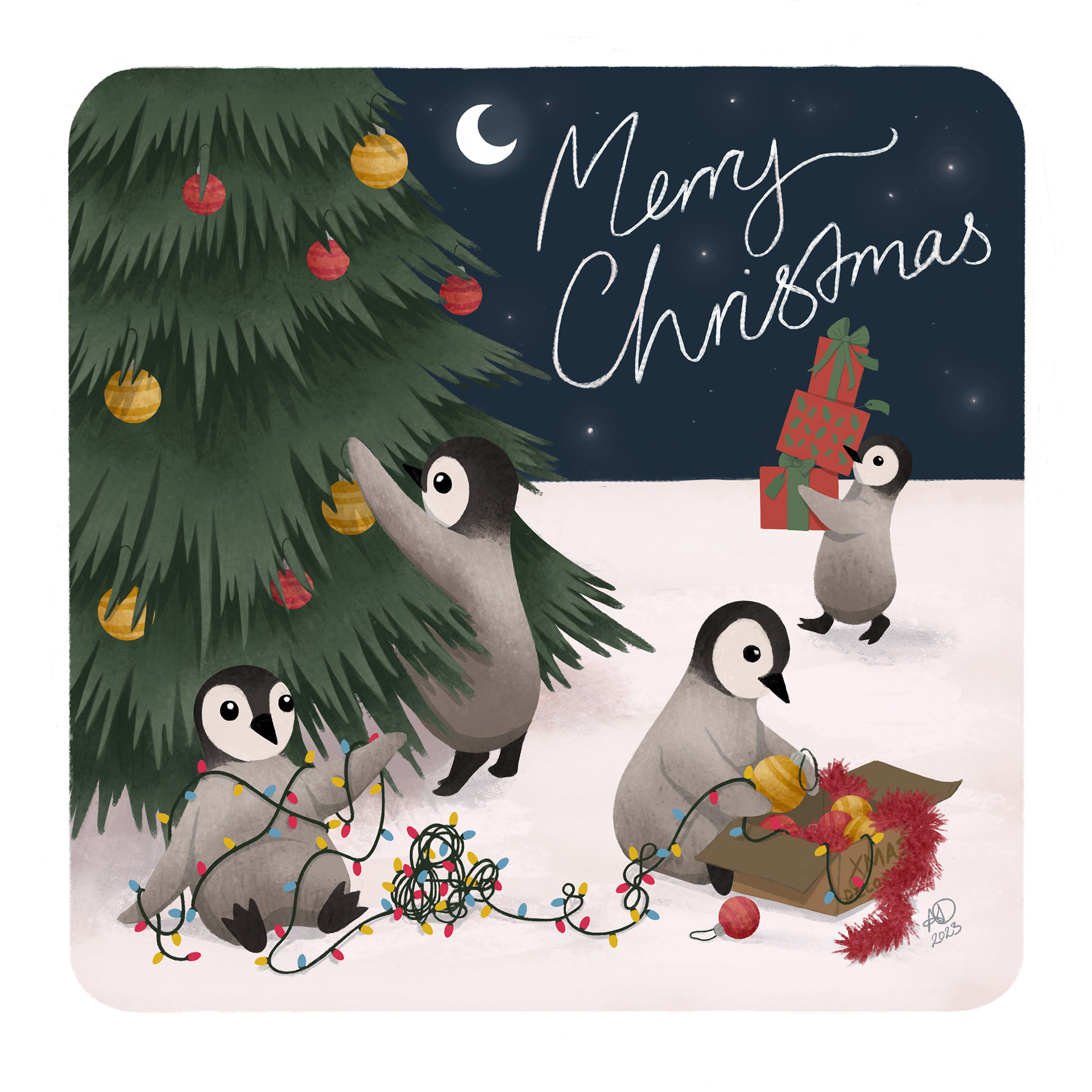 Four little penguins get ready for Christmas. A series of illustrations for Christmas cards. Available